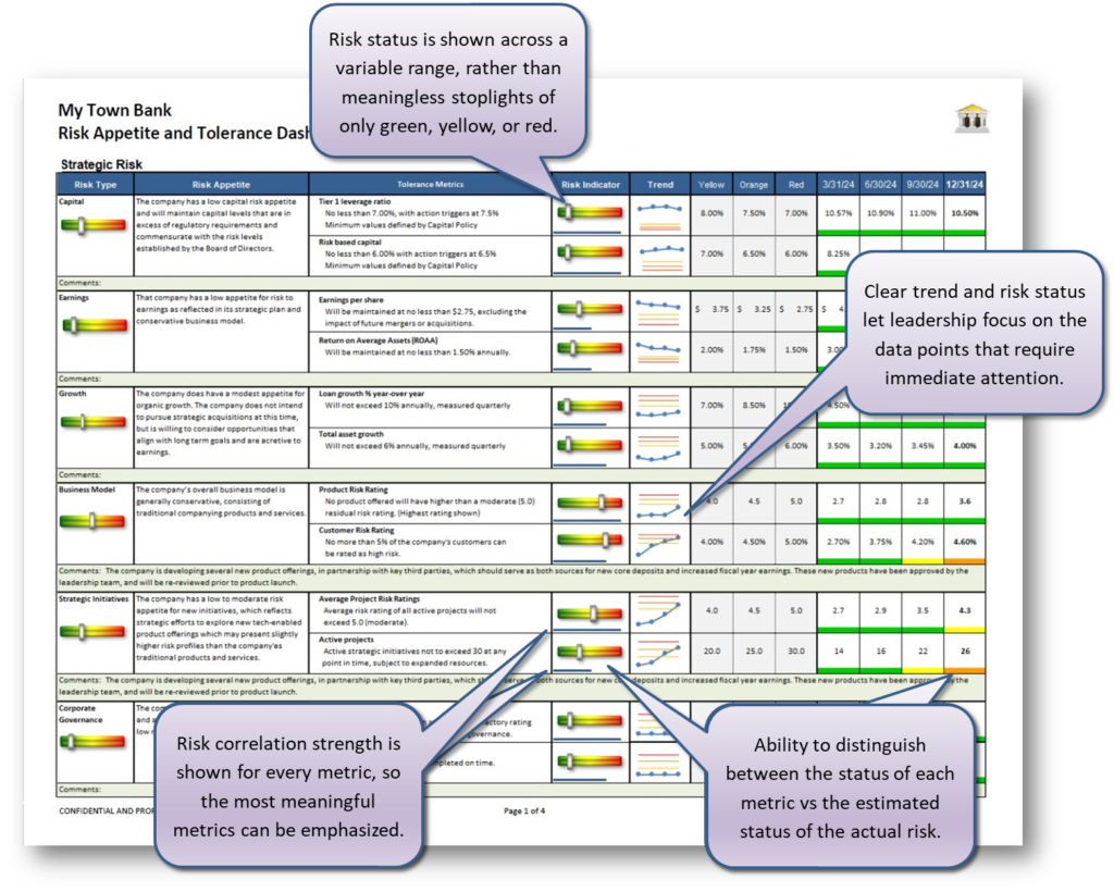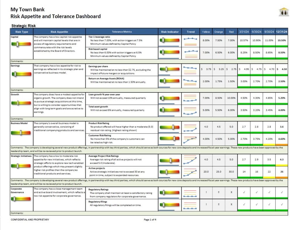 Ultimately, the purpose of metrics is to provide the board and senior leadership with a snapshot of risk status based on key indicators. While the included reporting dashboard can be modified in any way the company wishes, by default it includes a list of sample metrics, metric limits and multiple periods of example data, metric trends, and ultimately estimated risk status. Below each metric is also room for management commentary where warranted.