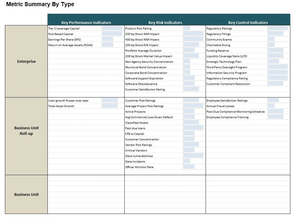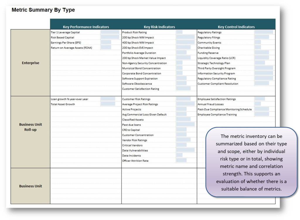 One example of analysis supported by having proper metric documentation is the ability to evaluate the population of metrics based on their respective scope (department only, department roll-up, or enterprise) and type (KPI, KRI, or KCI). This can be shown for individual risk types or in aggregate.